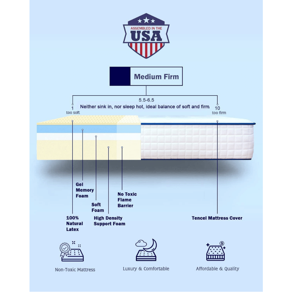 Featuring 1.5” of latex foam, 1” of gel memory foam, and 1.2” of soft foam, this mattress offers a firm feel that fully supports the body in all sleep positions - particularly those who sleep on their stomachs.
