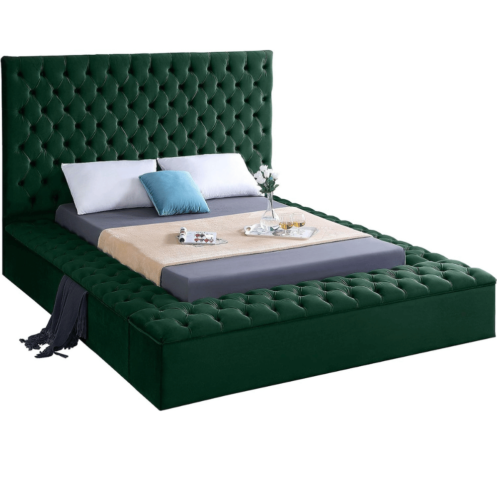 The Meridian Furniture Bliss Modern Velvet Upholstered Bed, with its deep button tufting and luxurious green velvet, appeals to those who taste sophistication and elegance in their bedroom decor.