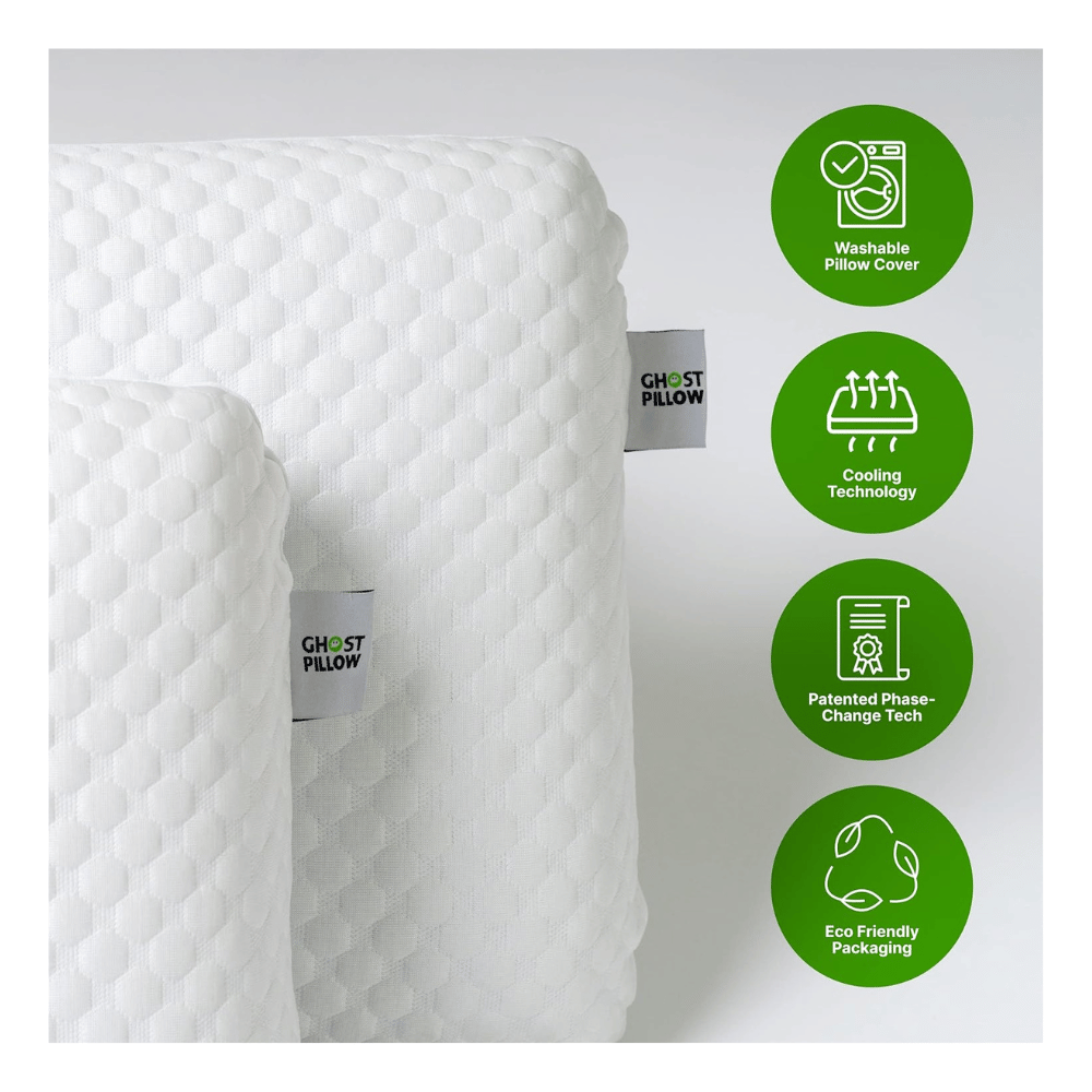 - The Ghost Pillow's patented phase change material absorbs and dissipates heat, maintaining a cool sleep environment. It also adjusts to temperature changes, ensuring consistent comfort throughout the night.